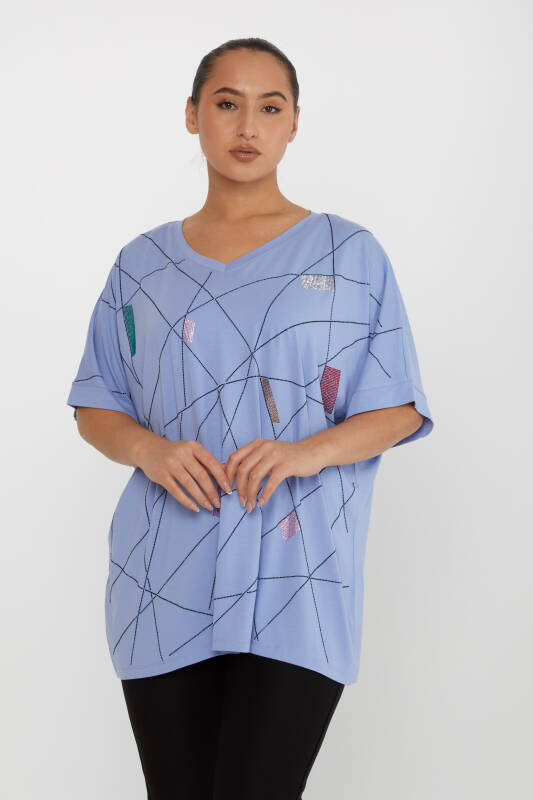 بلوزة مطرزة بالأحجار بأكمام قصيرة باللون الأزرق - 80110 | كازي (مجموعة من 4 مقاسات M-L-XL-2XL)
