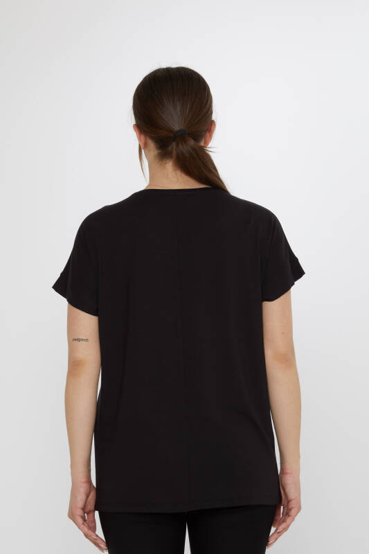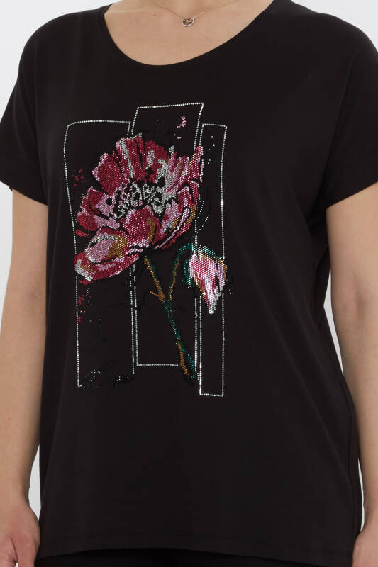 بلوزة مزينة بأحجار زهرية، بأكمام قصيرة، سوداء - 79602 | كازي (طقم من 4 قطع: M-L-XL-2XL)