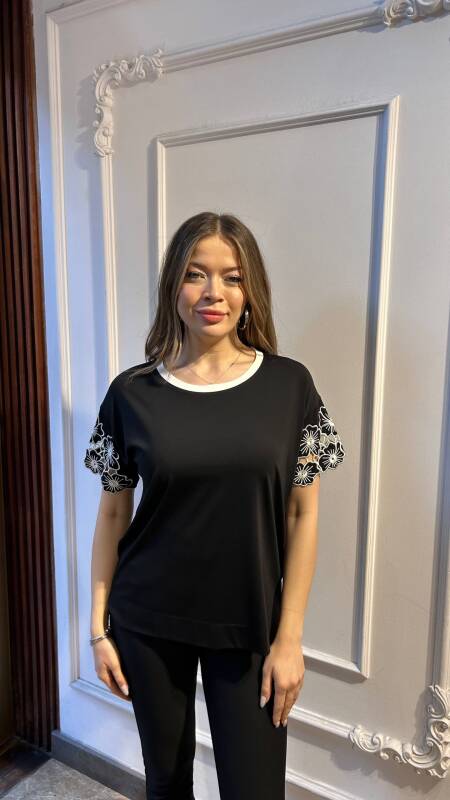 بلوزة مزينة بتفاصيل زهرية، بأكمام قصيرة، سوداء - 80004 | كازي (طقم من 3 قطع: M-L-XL)