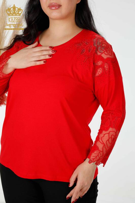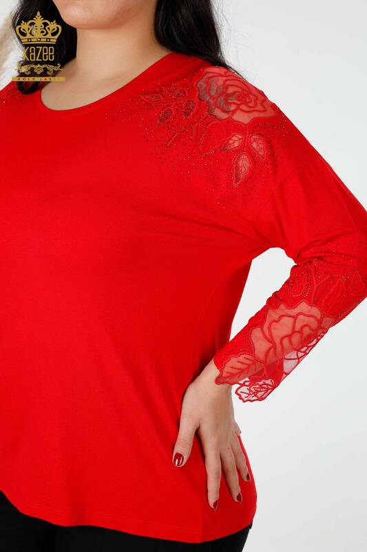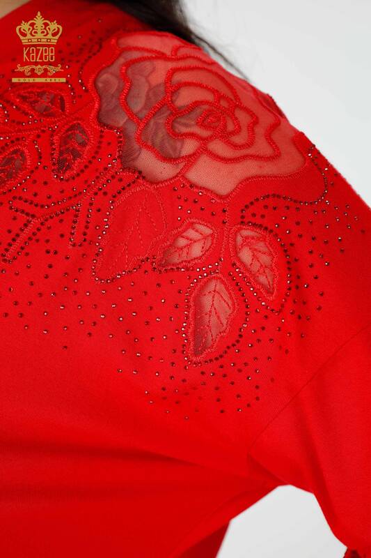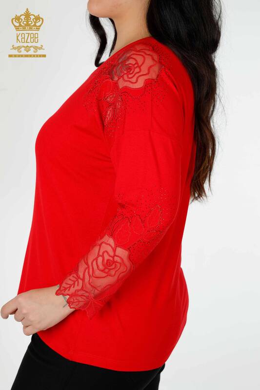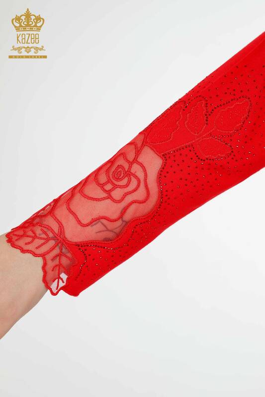 بلوزة نسائية - روز مزينة بالتول ومطرزة بأحجار حمراء - 77973 | كازي