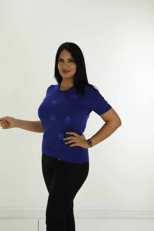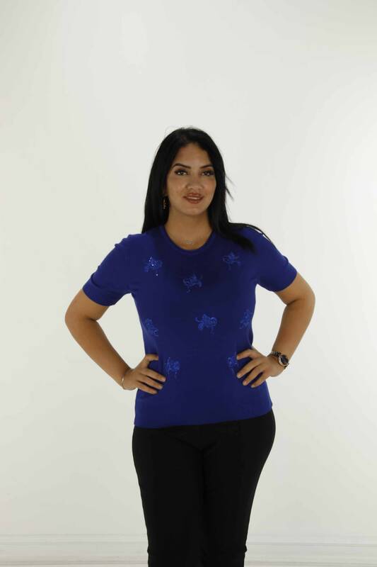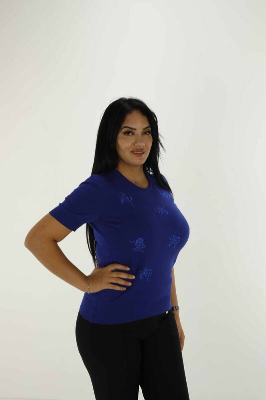 Bisiklet Yaka Kısa Kollu Taşlı Nakışlı Triko Saks - 30922 | KAZEE