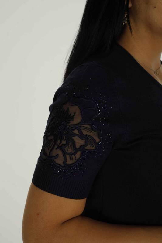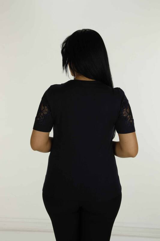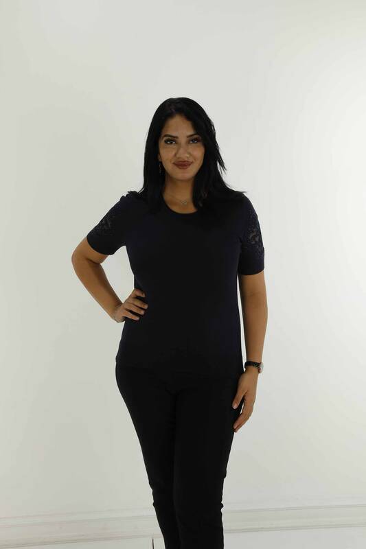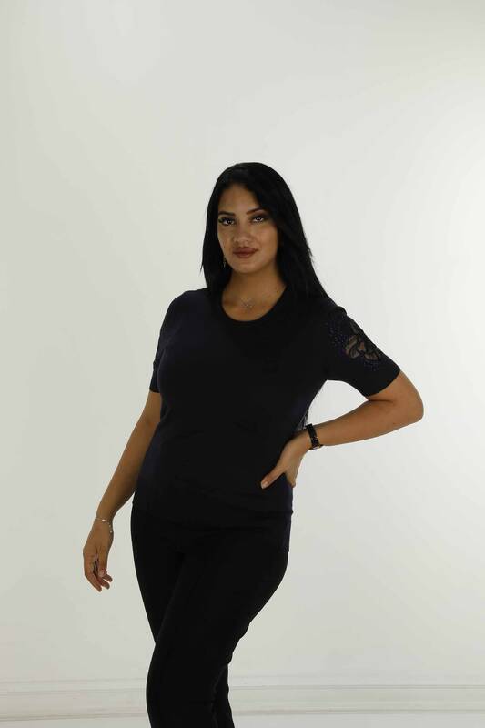 Bisiklet Yaka Kısa Kollu Taşlı Tüllü Triko Siyah - 30927 | KAZEE