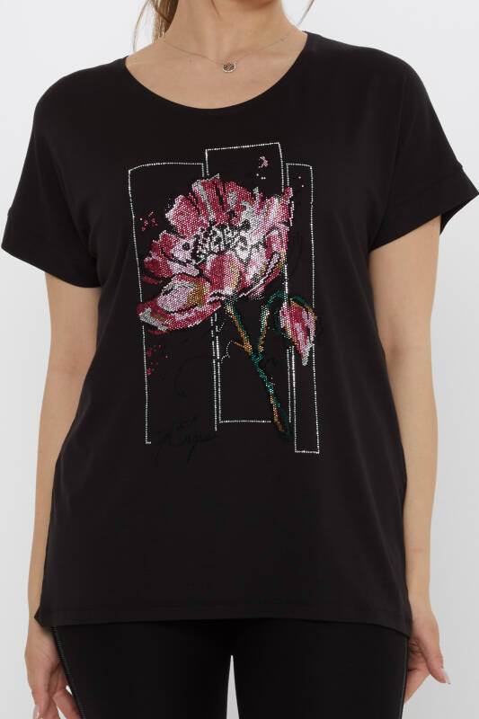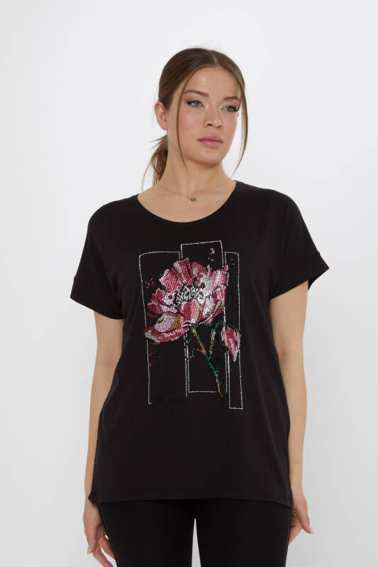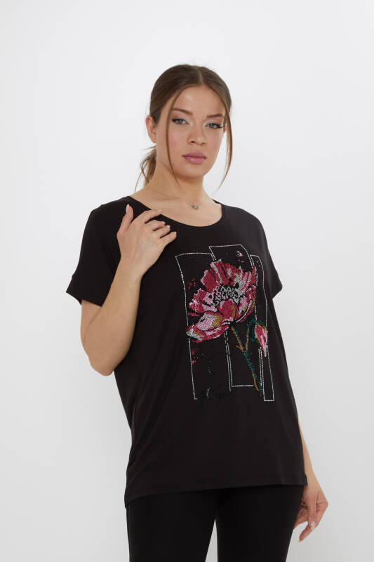 Blouse with Floral Stone Embellishments, Short Sleeves, Black - 79602 | KAZEE (4-Piece Set M-L-XL-2XL)