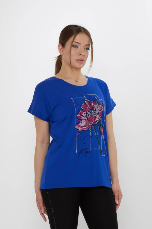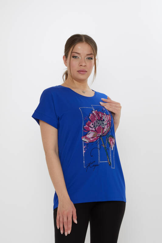 Blouse with Floral Stone Embellishments, Short Sleeves, Navy Blue - 79602 | KAZEE (Set of 4 M-L-XL-2XL)