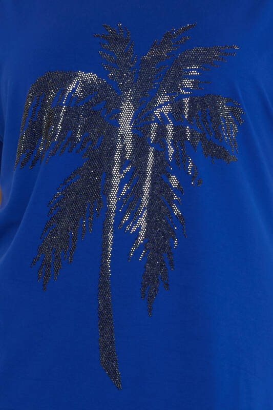 Palm Tree Patterned Embellished Short-Sleeved Blouse in Navy Blue - 79957 | KAZEE (4-Piece Set S-M-L-XL)