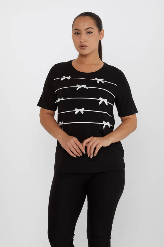 Blouse Ribbon Patterned Short Sleeve Black - 80050 | KAZEE (Set of 3 M-L-XL)