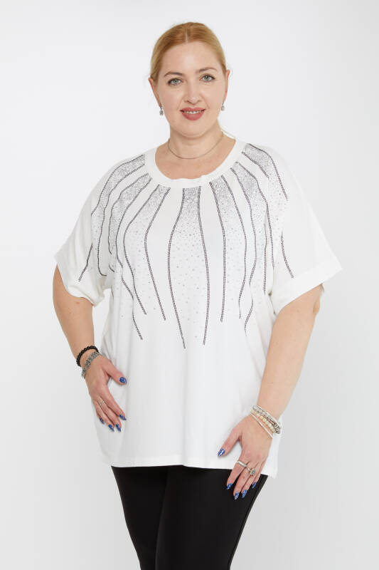 Bluse mit Steinstickerei, kurze Ärmel, Ecru – 79604 | KAZEE (4er-Set M-L-XL-2XL)