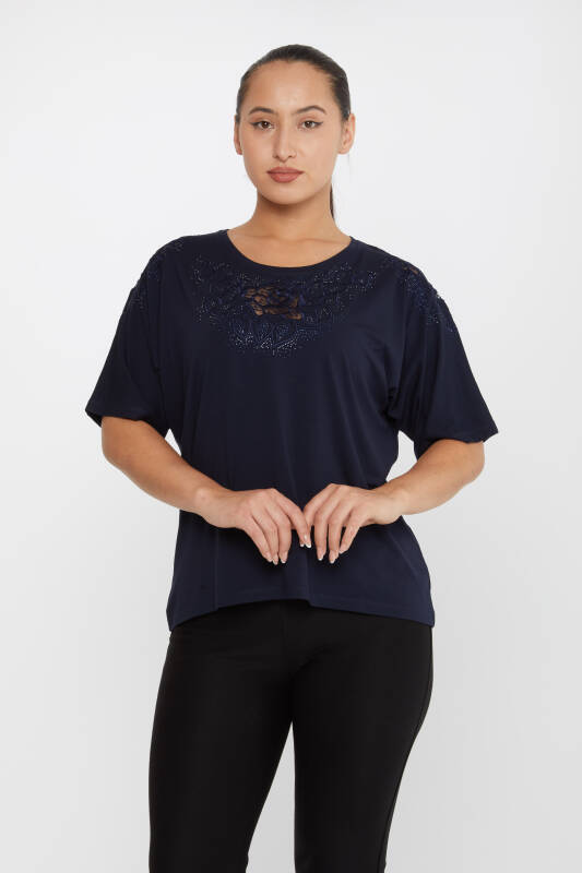 Bluse mit Rosenstickerei und Stoned Navy Blue – 80062 | KAZEE (4er-Set L-XL-2XL-3XL)