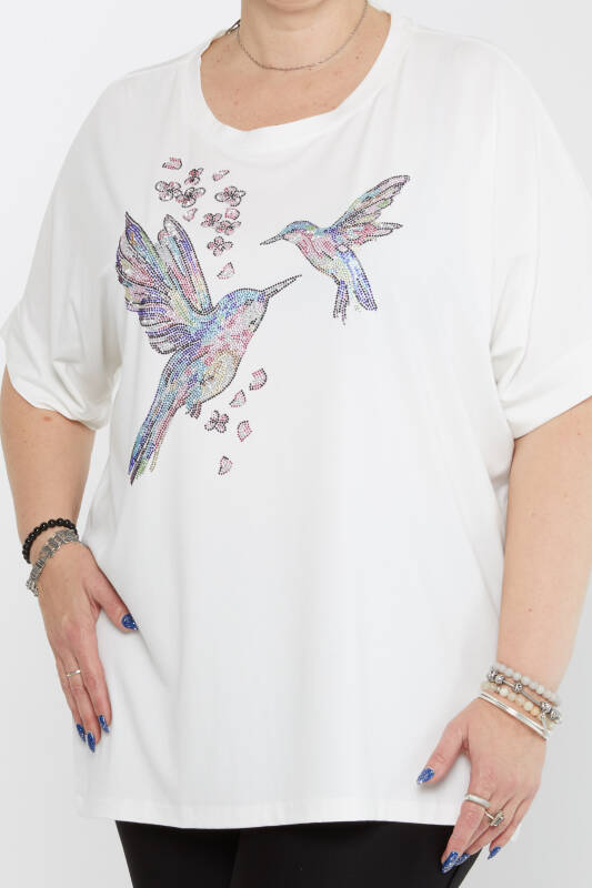 Bluse mit Vogelmuster und Steinstickerei, Ecru – 79948 | KAZEE (4er-Set M-L-XL-2XL)