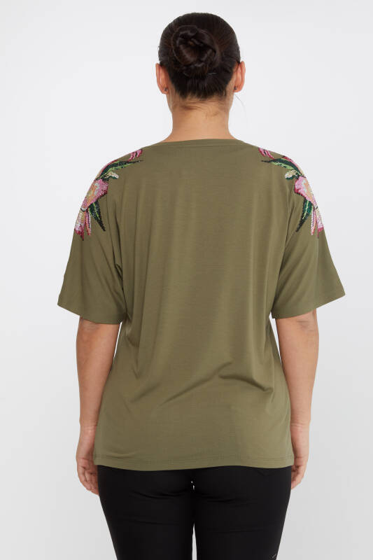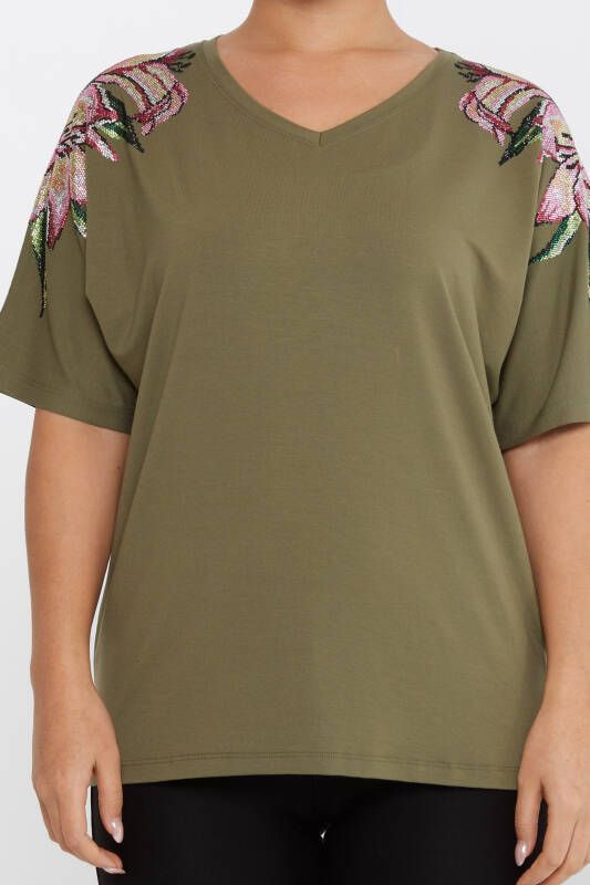 Blouse Flower Stone Embroidered Short Sleeve Khaki - 79585 | KAZEE (Set of 4 M-L-XL-2XL)