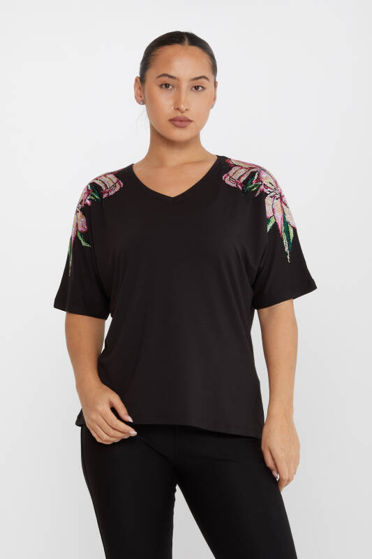 Chemisier Fleur Pierre Brodée Manches Courtes Noir - 79585 | KAZEE (Lot de 4 M-L-XL-2XL)