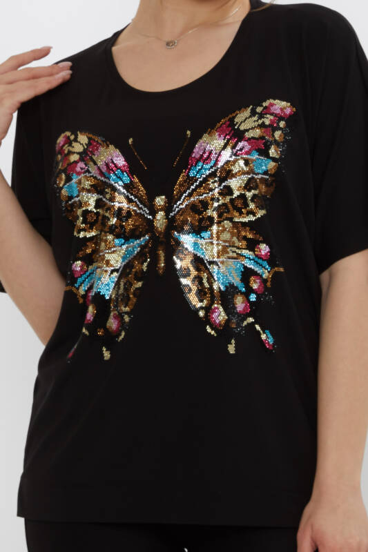 Bluzka z wzorem motyli, kolorowymi kamieniami i haftem w kolorze czarnym - 80046 | KAZEE (Zestaw 3 sztuk L-XL-2XL)
