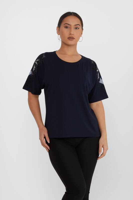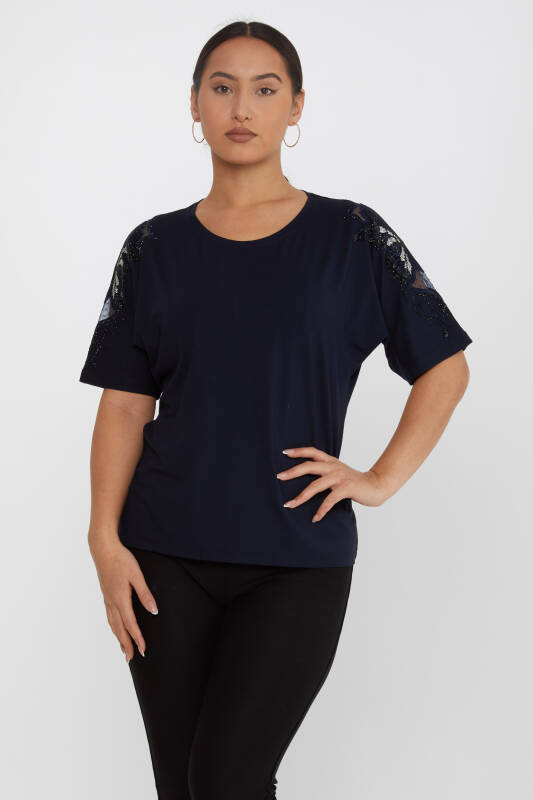 Bluz Kol Kelebek Desenli Taş İşlemeli Lacivert - 79613 | KAZEE (4'lü Set M-L-XL-2XL)
