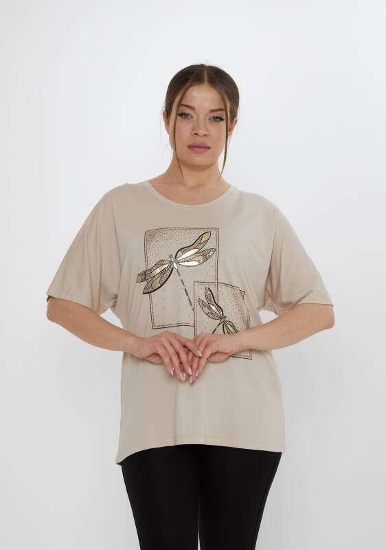 Bluz Taş İşlemeli Yusufçuk Desenli Kısa Kollu Bej - 80120 | KAZEE (3'lü Set M-L-XL)