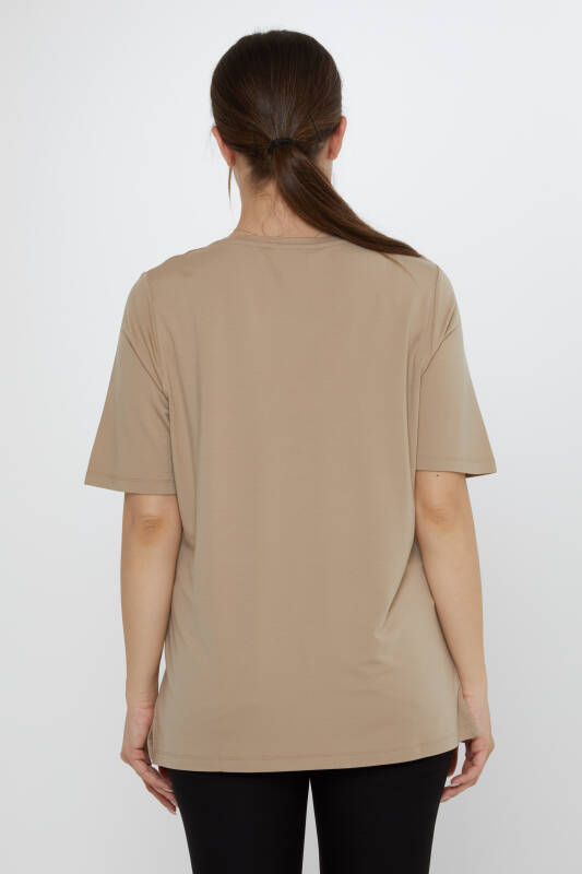 بلوزة منقوشة بأحجار وأكمام قصيرة باللون البيج - 80078 | كازي (مجموعة من 3 مقاسات L-XL-2XL)
