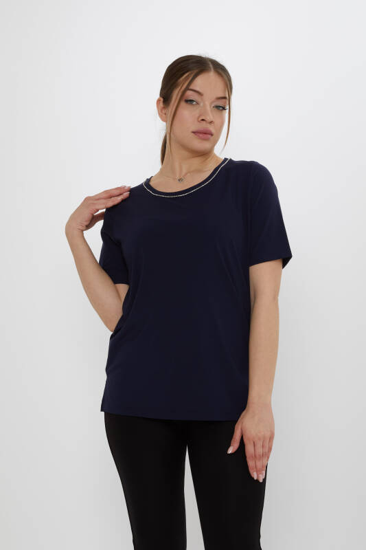 Bluză Guler Detaliu Piatră Mânecă Scurtă Bleumarin - 80030 | KAZEE (Set de 3 M-L-XL)