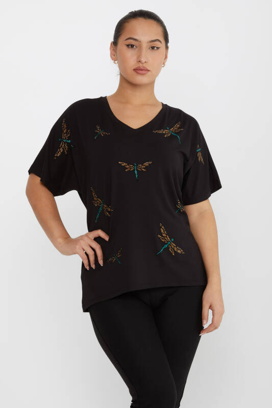 Bluză cu mânecă scurtă brodata cu piatra Neagra - 79622 | KAZEE (Set de 4 M-L-XL-2XL)