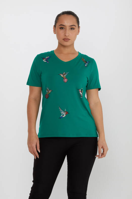 Bluzka Bird Stone haftowany dekolt w serek w kolorze zielonym - 80111 | KAZEE (zestaw 3 sztuk M-L-XL)