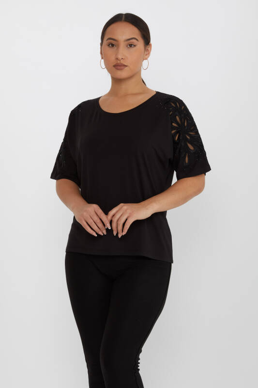 Bluzka z rękawami haftowanymi kamieniami haftowanymi na czarno - 79916 | KAZEE (zestaw 4 sztuk L-XL-2XL-3XL)