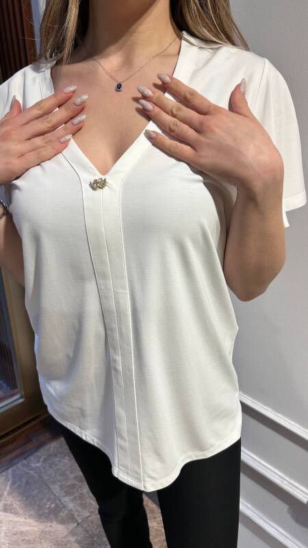 Блузка с V-образным вырезом и отделкой камнями, цвет экрю - 80185 | KAZEE (комплект из 3 предметов M-L-XL)