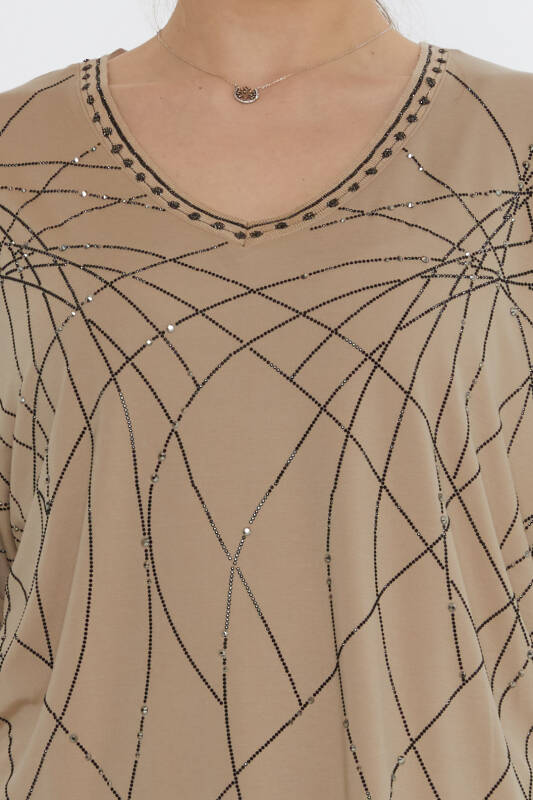 Bluzka z brokatem, zdobiona haftem kamyczkowym, beżowa - 80001 | KAZEE (Zestaw 3 sztuk L-XL-2XL)