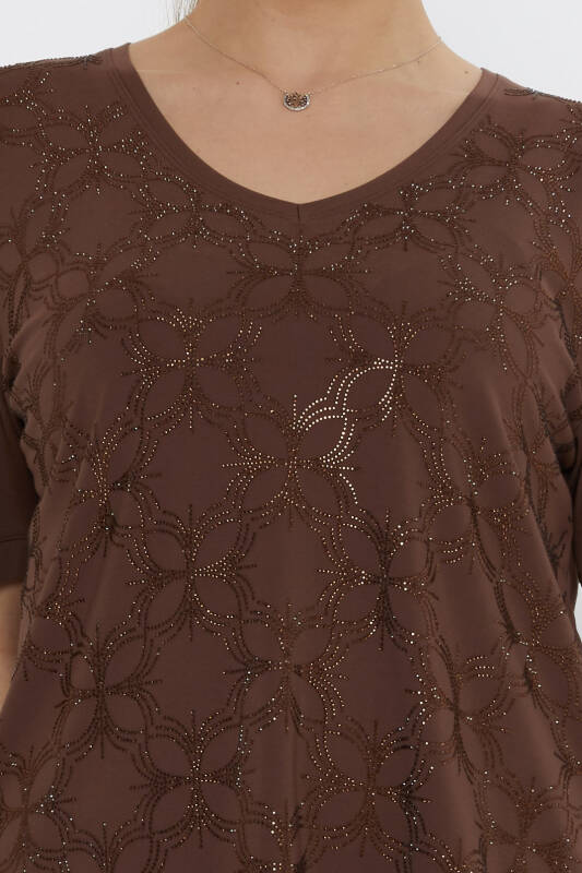 Bluzka z dekoltem w serek, haftowana kamieniami, brązowa - 80044 | KAZEE (Zestaw 3 sztuk L-XL-2XL)