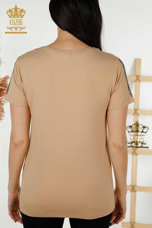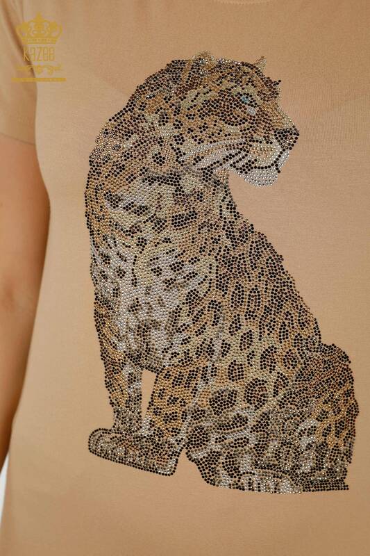 Camicetta da donna all'ingrosso motivo leopardato pietra ricamata manica corta beige - 78942 | KAZEE