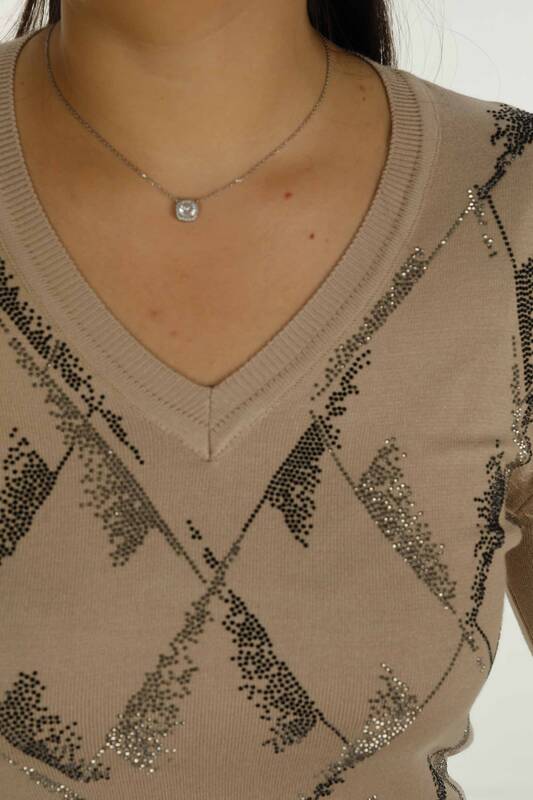 Tricot à manches longues et col en V avec détails en pierre Beige - 30688 | KAZÉE