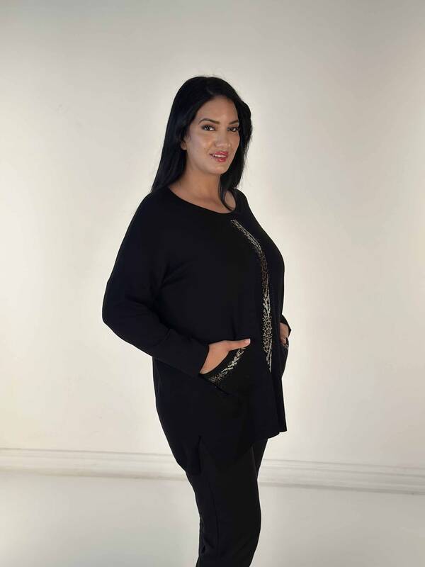 Vendita all'ingrosso Maglieria da donna Tasca maglione Dettagliata pietra ricamata modello leopardo girocollo nero - 30621 | KAZEE