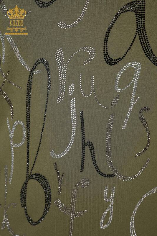 Camicetta Khaki delle donne all'ingrosso con pietra di cristallo ricamato dettaglio lettera-78833 / KAZEE