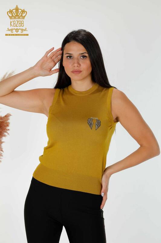 Maglieria donna all'ingrosso angelo ala fantasia senza maniche con pietra ricamato senape-16921 / KAZEE
