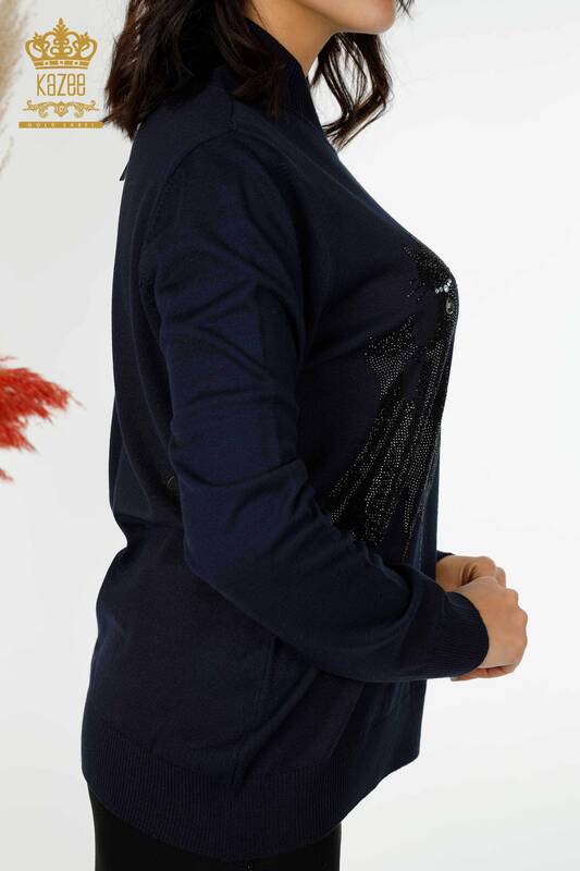 Maglione di maglieria delle donne all'ingrosso con il modello del gatto con il ricamo di pietra blu Navy-16969 / KAZEE