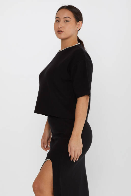 Costum dublu cu fantă și broderie cu piatră Negru - 31302 | KAZEE (Set de 3 S-M-L)