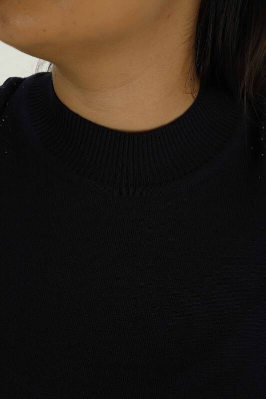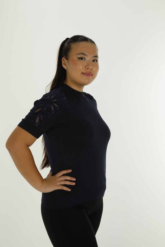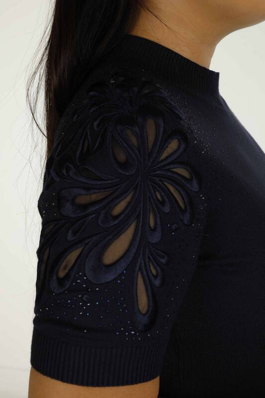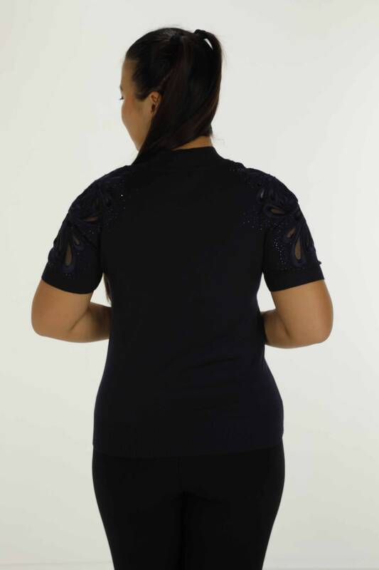 Dik Yaka Kısa Kol Nakışlı Triko Lacivert - 30923 | KAZEE