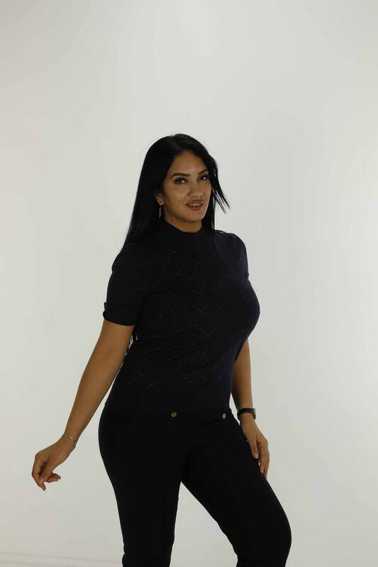 Dzianina z wysokim kołnierzem i krótkim rękawem w kolorze kamienia Granatowa - 30651 | KAZEE