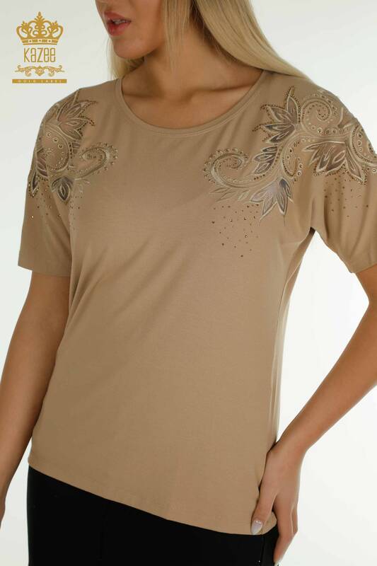 Bluză de damă cu ridicata cu mâneci scurte cu modele florale, brodate cu piatră, bej - 79093 | KAZEE