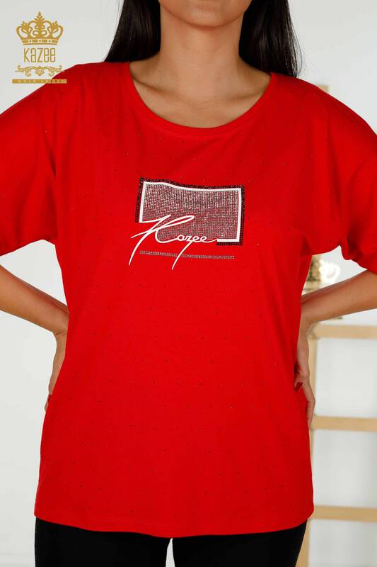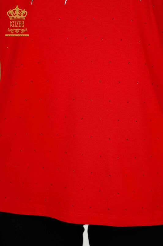 Bluză de damă cu mânecă scurtă cu piatră de cristal brodat roșu - 79389 | KAZEE