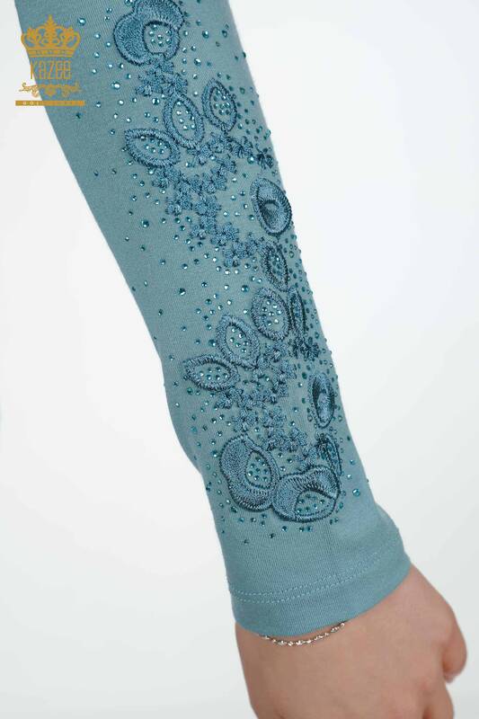 Bluză de damă cu ridicata cu piatră de cristal brodat cu model de flori Albastru - 79010 | KAZEE