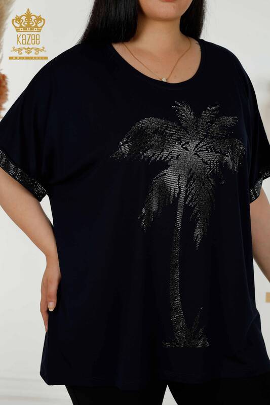 Bluză de damă cu ridicata cu mânecă scurtă cu modele brodate cu piatră Bleumarin - 79325 | KAZEE