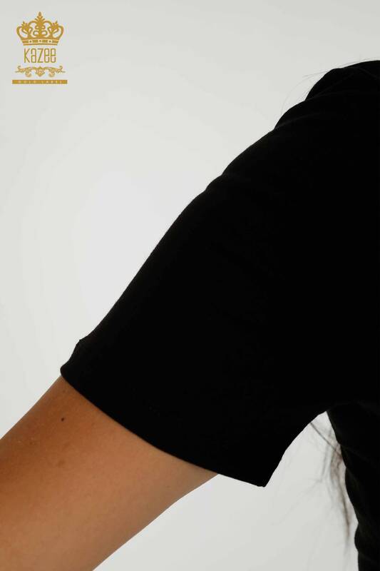 Bluză de femei cu model cu mânecă scurtă, brodata cu piatră, negru - 79279 | KAZEE