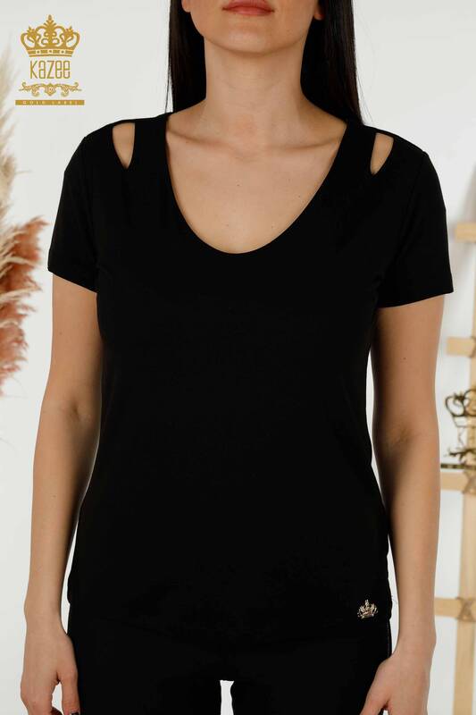 Bluză cu ridicata pentru femei, cu umăr, cu logo-ul de bază, mânecă scurtă, negru - 79220 | KAZEE