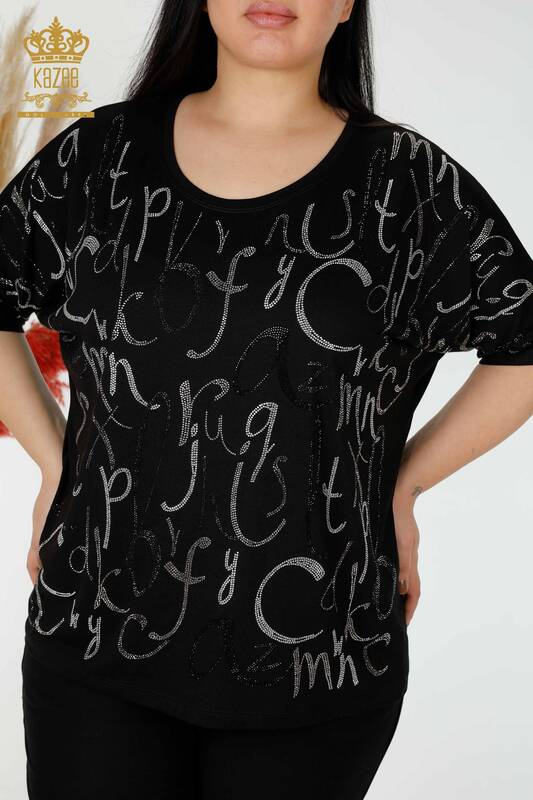 Bluză de damă cu ridicata cu detaliu litere brodate cu piatră de cristal neagră - 78833 | KAZEE