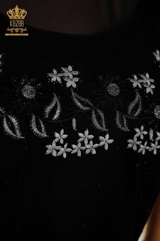 Bluză de damă cu ridicata din tul cu modele florale brodate cu piatră neagră - 79137 | KAZEE
