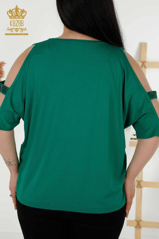 Bluză cu ridicata pentru femei, cu umeri, brodate cu piatră verde - 79108 | KAZEE
