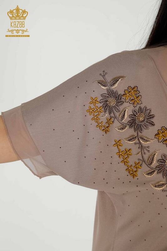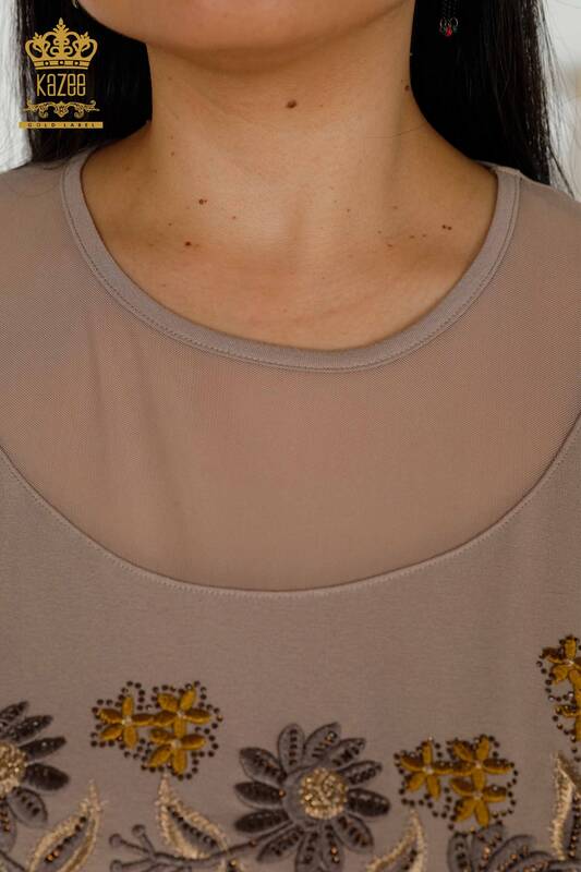 Bluză de damă cu ridicata din tul cu modele florale din nurcă brodat cu piatră - 79137 | KAZEE