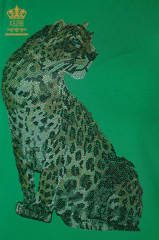 Bluză de damă cu ridicata cu mânecă scurtă cu model leopard brodat cu piatră verde - 78942 | KAZEE