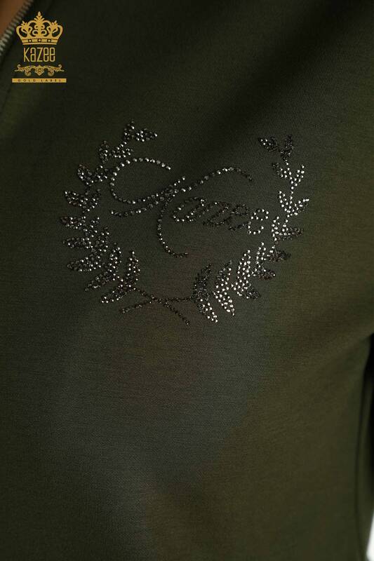 En-gros Set de trening pentru femei cu mânecă scurtă, brodat cu piatră, buzunar cu fermoar kaki - 17636 | KAZEE
