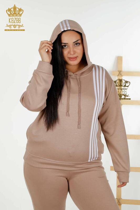 Set de trening pentru femei cu glugă, în dungi, două culori, alb, nurcă închisă - 17569 | KAZEE