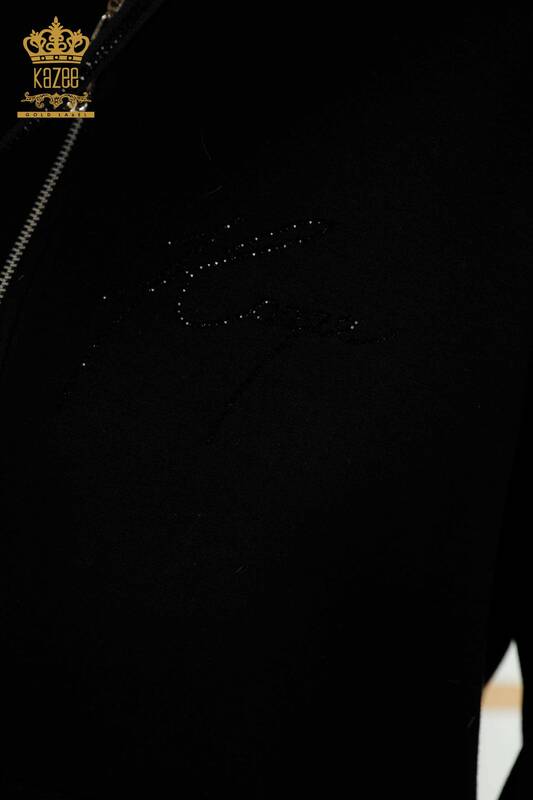 Set de trening pentru femei negru cu buzunare brodate cu piatra cu gluga - 17598 | KAZEE