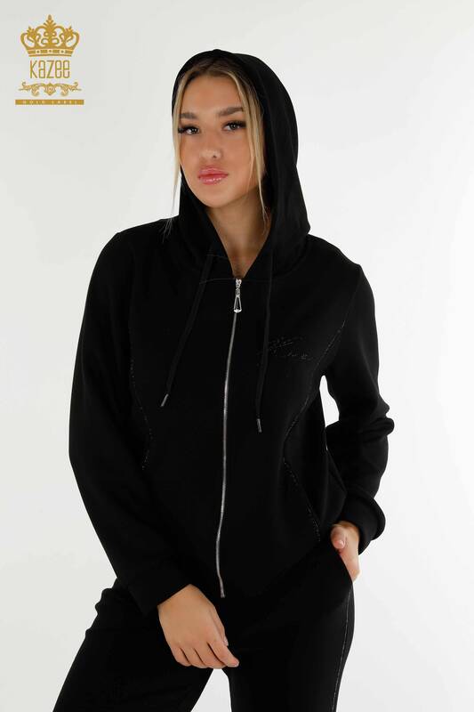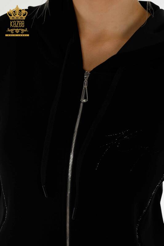 Set de trening pentru femei negru cu fermoar cu glugă cu broderie de piatră - 20414 | KAZEE